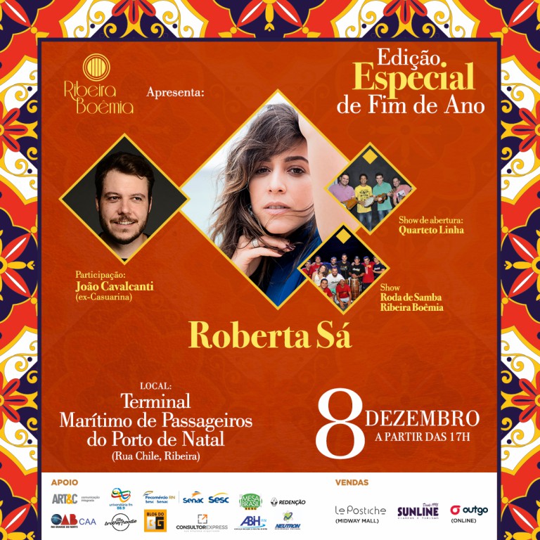 Os artistas Roberta Sá e João Cavalcanti são as atrações nacionais da edição especial de final de ano do Projeto Cultural Ribeira Boêmia, que acontece no dia 8 de dezembro, a partir das 17h, no Terminal Marítimo de Passageiros do Porto de Natal, na Ribeira. O show de abertura será do grupo Quarteto Linha, que recentemente retornou aos palcos potiguares, interpretando, além de composições próprias, grandes clássicos do samba.