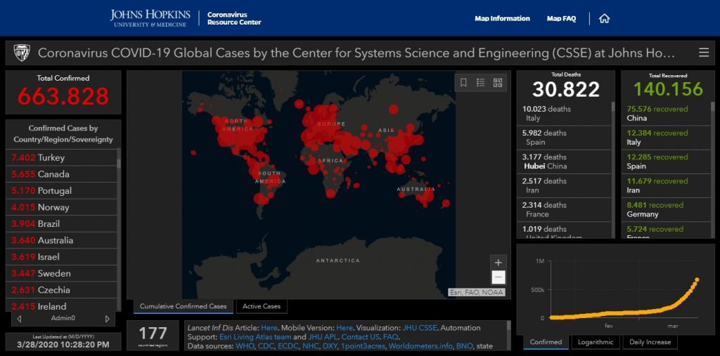 Atualmente, são 663.828 casos confirmados do novo coronavírus em todo o mundo. O Brasil tem, segundo o monitoramento da Universidade Johns Hopkins, 3.904 casos, mesmo número divulgado pelo Ministério da Saúde.