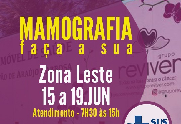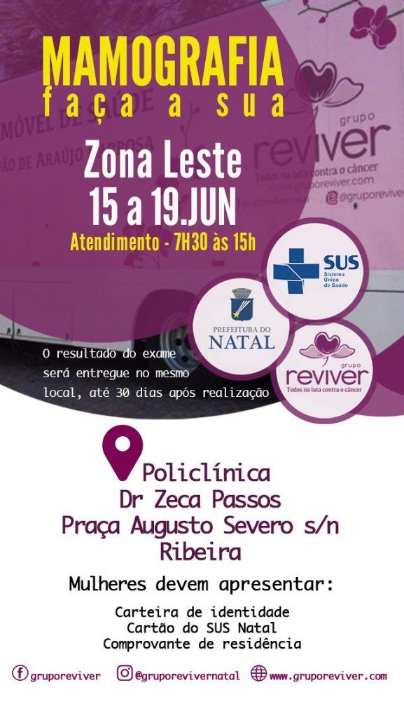 O Grupo Reviver retoma nesta segunda-feira (8) o mutirão de mamografias, suspenso desde o início da pandemia. A Unidade Móvel Savana Galvão estará até o dia 19 de junho, à exceção dos finais de semana e feriado de Corpus Christi (11) e anticipação do feriado dos Mártires (12), das 7h30 às 15h, na Policlínica Dr Zeca Passos, situada à Praça Augusto Severo, na Ribeira. A demanda de pacientes continua a ser livre, com distribuição de fichas sempre no início do expediente.