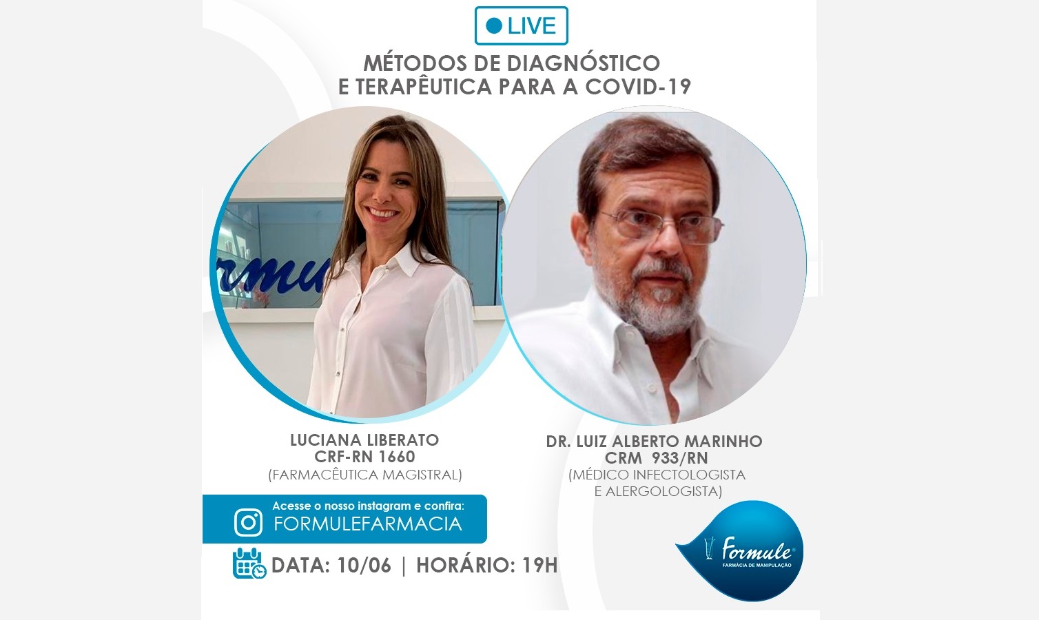 Nesta quarta-feira (10/06),às 19h, a Formule preparou uma live abordando o tema “Métodos de diagnóstico e terapêutica para a COVID-19”.