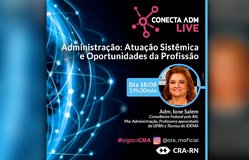 A conversa será sobre “Administração: Atuação Sistêmica e Oportunidades da Profissão”, e contará com a participação da Conselheira Federal pelo RN, Msc em Administração, Professora Adjunta aposentada da UFRN e Técnica do IDEMA, uma das fundadoras do CRA-RN, Adm. Ione Macedo de Medeiros Salem.