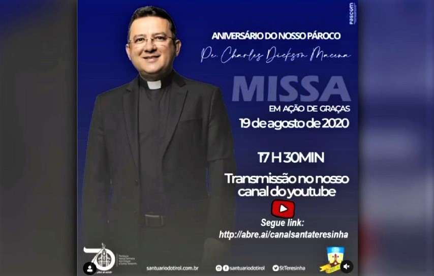 Não será possível abraçá-lo e saudá-lo pessoalmente, mas vamos juntos com ele, agradecer a Deus pelo o dom de sua vida, em uma missa que será transmitida pelo canal da paróquia no YouTube às 17h30: www.youtube.com/channel/UCquw8u44ax4yUu0562qeASg
