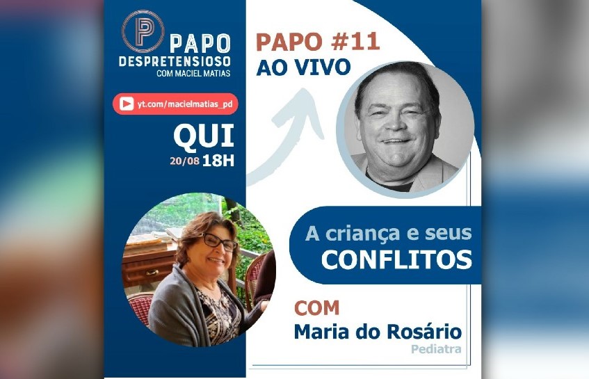 O médico oncologista Maciel Matias recebe nesta quinta-feira (20/08), às 18h, no seu canal no YouTube, a pediatra Maria do Rosário para falar sobre o tema: “A Criança e seus Conflitos”. Um papo descontraído sobre o universo infantil, seus dilemas, questionamentos e muito mais.