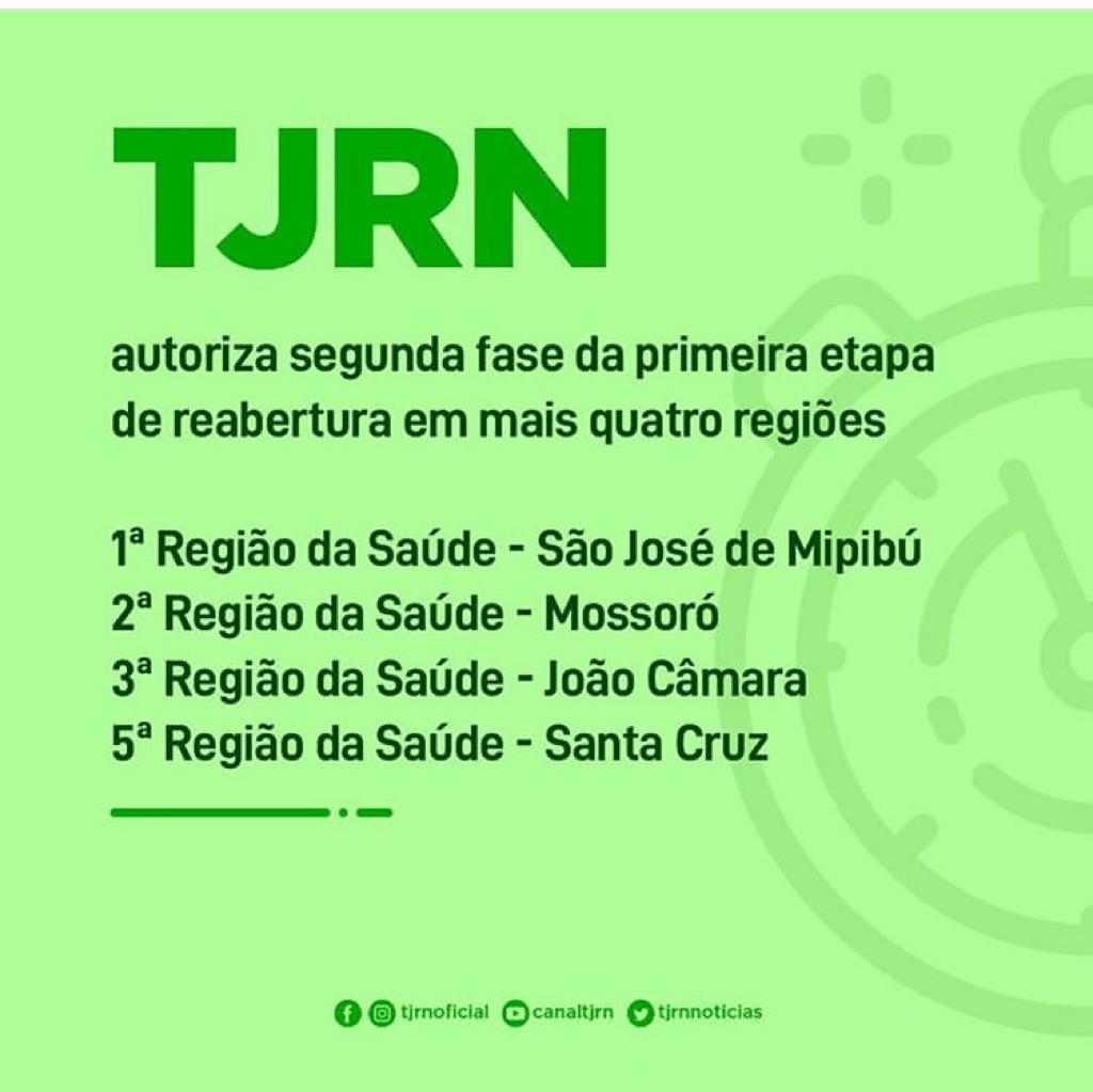 O início da segunda fase da primeira etapa do Plano de Reabertura Gradual das Atividades Presenciais no Poder Judiciário do Estado do Rio Grande do Norte começa nesta quarta-feira 2 de setembro, nas unidades judiciárias da 1ª Região de Saúde (São José de Mipibu), 2ª Região de Saúde (Mossoró), 3ª Região de Saúde (João Câmara) e 5ª Região de Saúde (Santa Cruz). A medida faz parte da Portaria Conjunta nº 41/2020 – TJ, de 31 de agosto de 2020. O dispositivo foi publicado no Diário da Justiça Eletrônico.