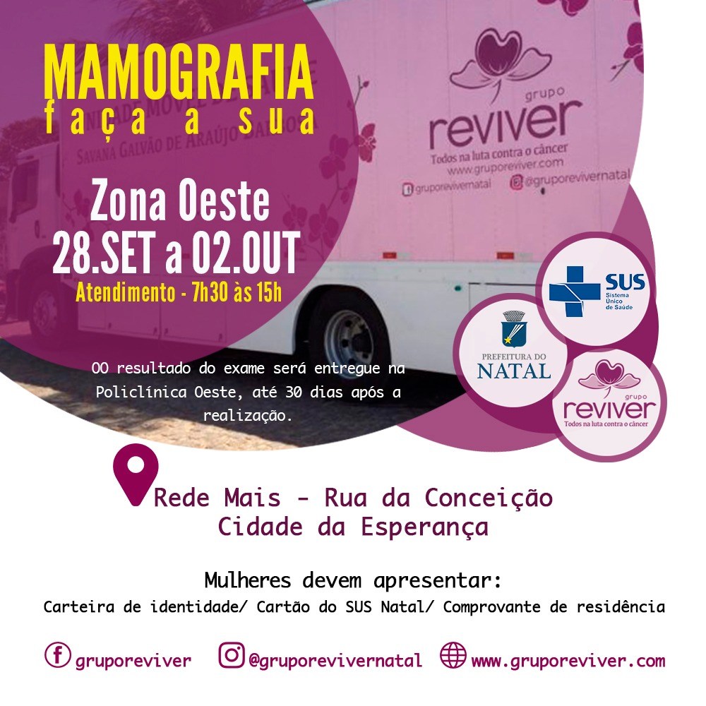 GRUPO REVIVER FAZ MUTIRÃO DE MAMOGRAFIAS NA ZONA OESTE DE 28 DE SETEMBRO A 02 DE OUTUBRO