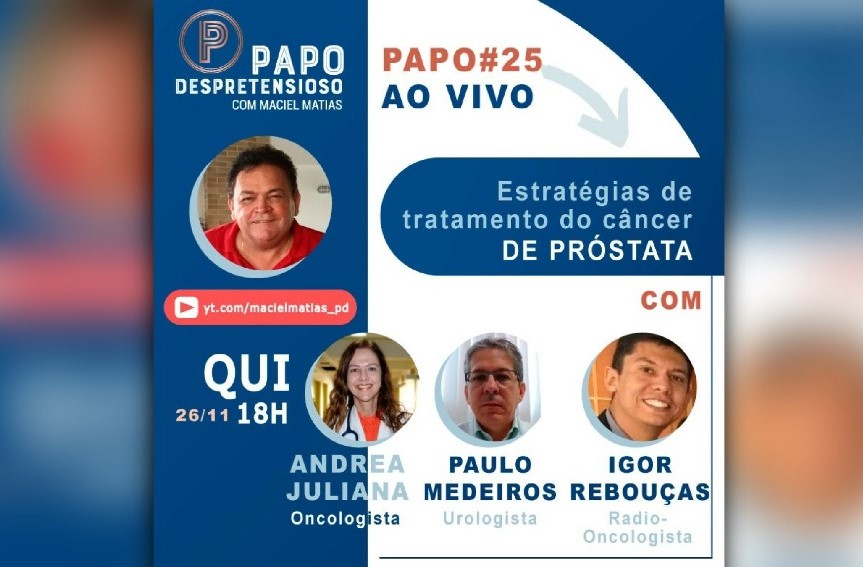 O médico oncologista Maciel Matias recebe nesta quinta-feira (26/11), às 18h, no seu canal no YouTube, sobre o tema: “Estratégias de Tratamento do Câncer de Próstata” com a oncologista, Andrea Juliana, o urologista Paulo Medeiros e o radiologista Igor Rebouças.