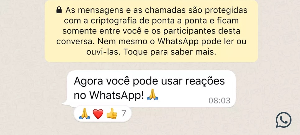 Uma novidade do WhatsApp animou os usuários nas redes sociais nesta sexta-feira (6): a empresa começou a liberar reações a mensagens com emojis. A chegada do recurso foi anunciada nesta quinta, mas está sendo distribuída aos poucos para os sistemas Android e iOS (saiba como atualizar).