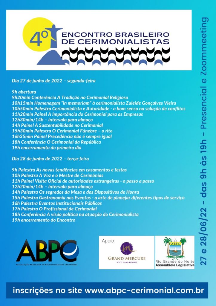 O 4º Encontro Brasileiro de Cerimonialistas, promovido pela Associação Brasileira de Profissionais de Cerimonial (ABPC), vai acontecer no Rio de Janeiro nos dias de 27 e 28 de junho e vem trazer uma reflexão sobre como o mercado está acompanhando as mudanças, com grandes nomes do cenário de eventos e da política nacional para um abrangente debate sobre de que forma podemos ter uma melhor atuação e como as mudanças comportamentais trouxeram uma nova forma de fazer eventos em sua estrutura, organização, sustentabilidade e segurança, não só na questão física, mas também de saúde pública.