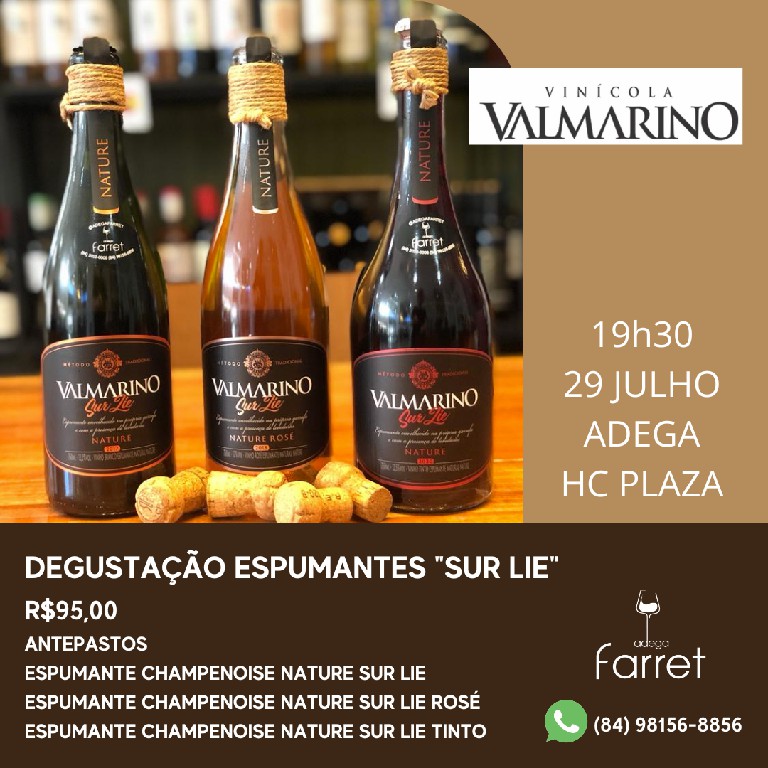 A degustação será realizada na próxima sexta, 29 de julho, na Adega climatizada da loja no HC Plaza para participantes inscritos previamente ao custo de R$95,00 com três espumantes e antepastos. O evento será conduzido pela Sommelier Simone Farret e terá apresentação da técnica ancestral e degustação dos três espumantes – branco, rosé e tinto Sur Lie Valmarino Nature produzidos no terroir de altitude Pinto Bandeira, na Serra Gaúcha.