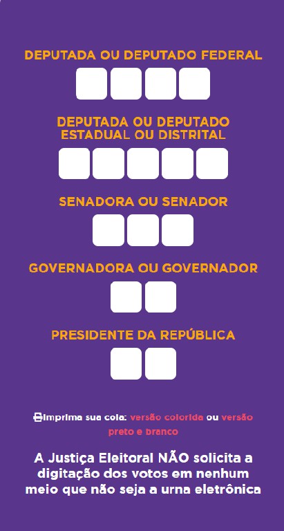 É essencial preparar a ‘colinha’,. que traz a ordem de votação que deve ser seguida na urna eletrônica para os cinco cargos em disputa nas Eleições de 2022: Deputado Federal, Deputado Estadual, Senador, Governador e vice e Presidente da República e vice. No site do TRE tem um modelo da colinha que pode ser impresso também por qualquer eleitor.