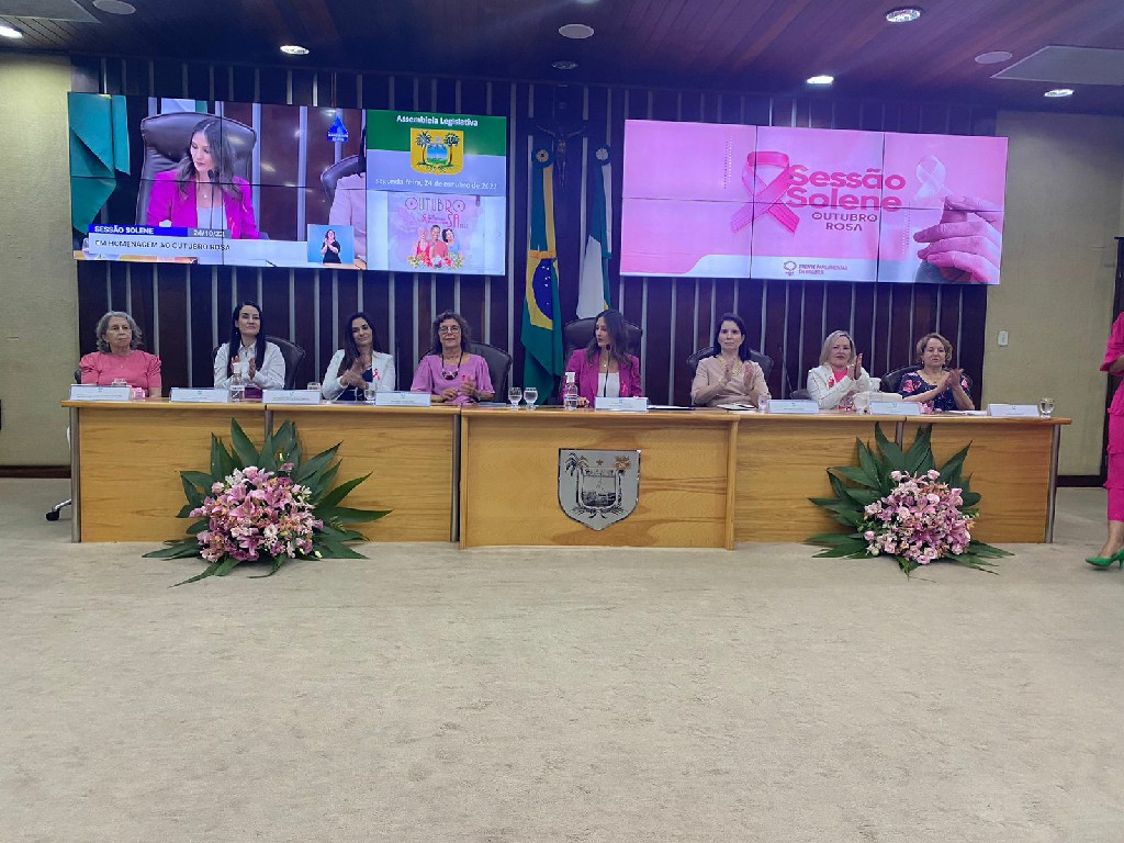 Manhã presidida pela Deputada Cristiane Dantas, dividindo momentos com a companheira deputada Eudiane Macedo. Evento com plenário e galeria lotada em tons de rosa. Mesa composta por nomes representativos de poderes judiciários.