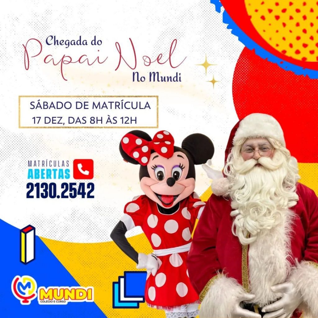 SÁBADO TEM CHEGADA DO PAPAI NOEL E PLANTÃO DE MATRÍCULAS COM CONDIÇÕES ESPECIAIS NO MUNDI COLÉGIO E CURSO