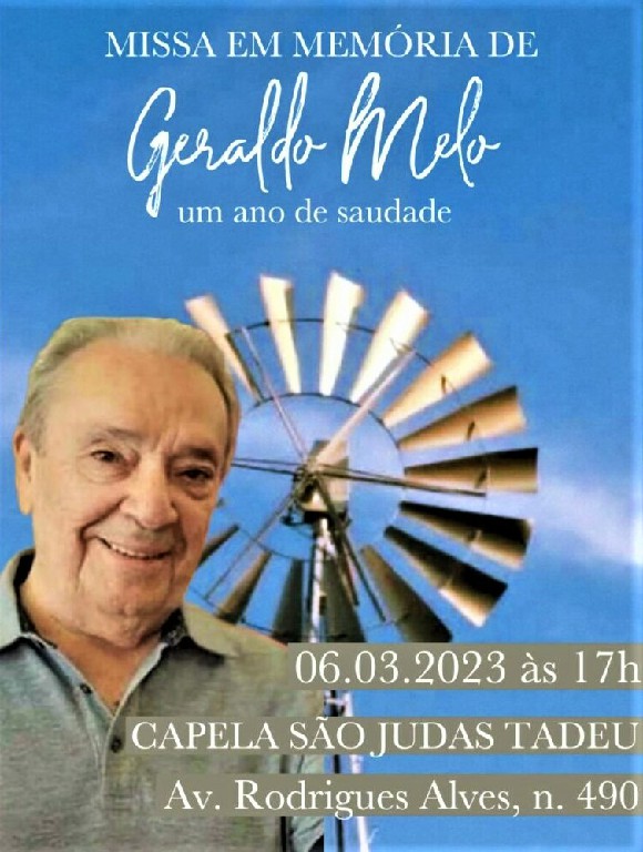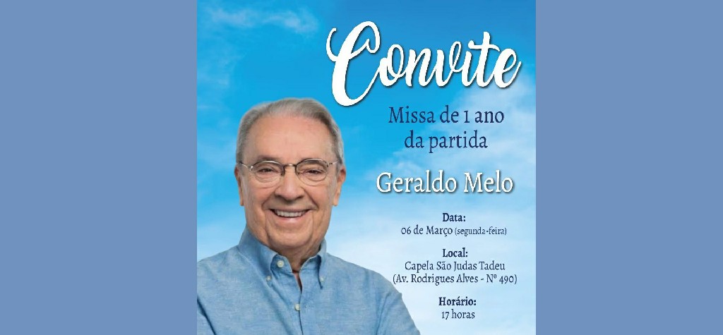 Na Hora H MISSA DE 1 ANO EM MEMÓRIA DE GERALDO MELO By Hilneth Correia Posted on 4 de março de 2023 Share Tweet Share Share Email Comments A família do ex-governador Geraldo Melo convida os amigos para a missa de um ano de falecimento do político. A cerimônia religiosa será na próxima segunda-feira, dia 6 de março, às 17h, na Capela São Judas Tadeu, Av. Rodrigues Alves, Tirol. Related Items:destaque Share Tweet Share Share Email