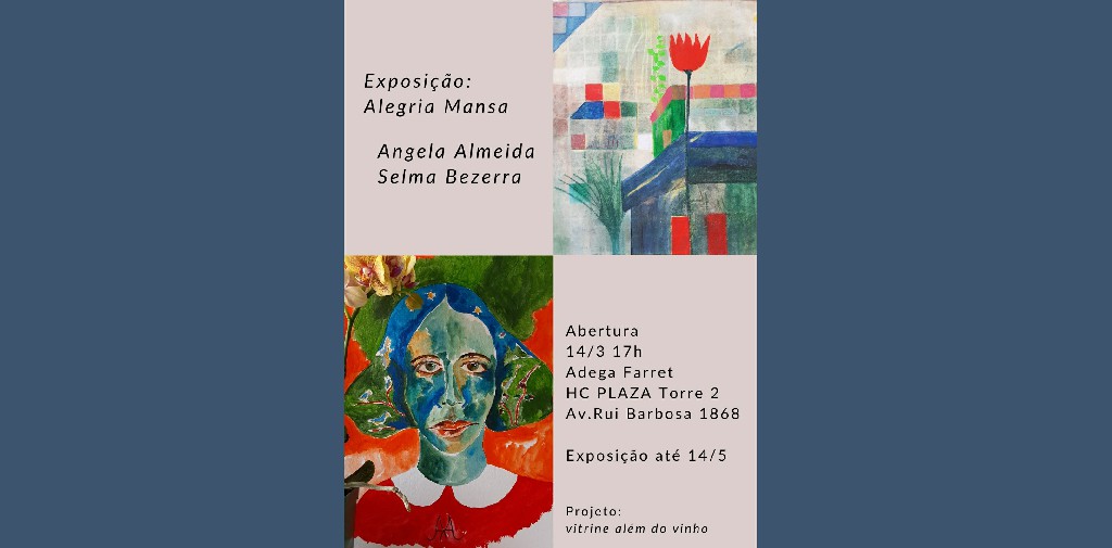 A exposição “Alegria Mansa” vai reunir as artistas plásticas potiguares Angela Almeida e Selma Bezerra dentro do projeto “vitrine além do vinho”. A abertura será realizada com coquetel para convidados no dia 14 de março na adega climatizada da Adega Farret, no Centro Empresarial HC Plaza onde os trabalhos serão expostos até o dia 14 de maio.