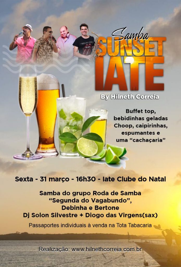 Vamos curtir o pôr do sol do Iate Clube ao som de do grupo Roda de Samba “Segunda do Vagabundo”, Debinha e Berthone, grandes nomes da nossa música, do nosso samba raíz. E, para completar, o agito ficará a cargo do Dj Solon Silvestre e do Sax de Diogo das Virgens.