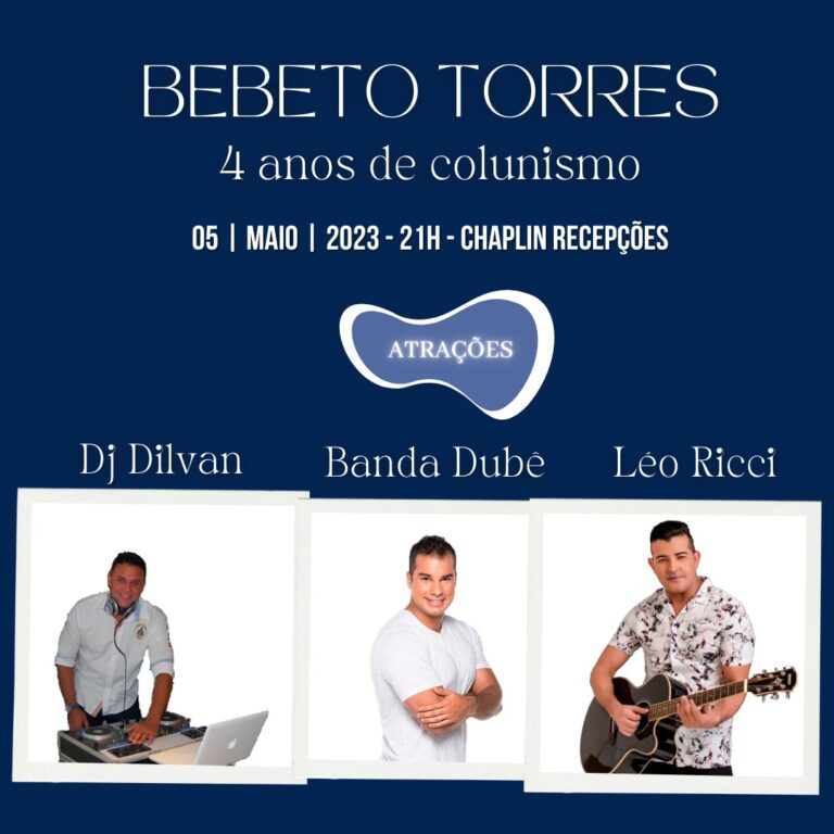Vamos festejar com o coleguinha Bebeto Torres, que celebra 4 anos de colunismo em grande estilo no próximo dia 5 de maio, às 21h, no Chaplin Recepções.