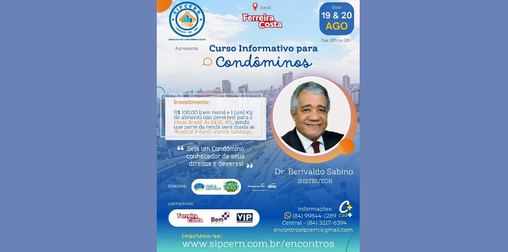 O programa Mesa Brasil do Sesc RN será beneficiado com quilos de alimentos entregues como parte das inscrições no “Curso Informativo para Condôminos”, um evento educativo e com caráter solidário que visa oferecer conhecimentos fundamentais para a gestão de condomínios. Realizado pelo Sindicato dos Condomínios, Administradoras e Shoppings Centers do RN, SIPCERN, o curso acontece no auditório da loja Ferreira Costa, no fim de semana dos dias 19 e 20 de agosto, e as inscrições encerram na próxima segunda-feira, dia 14.