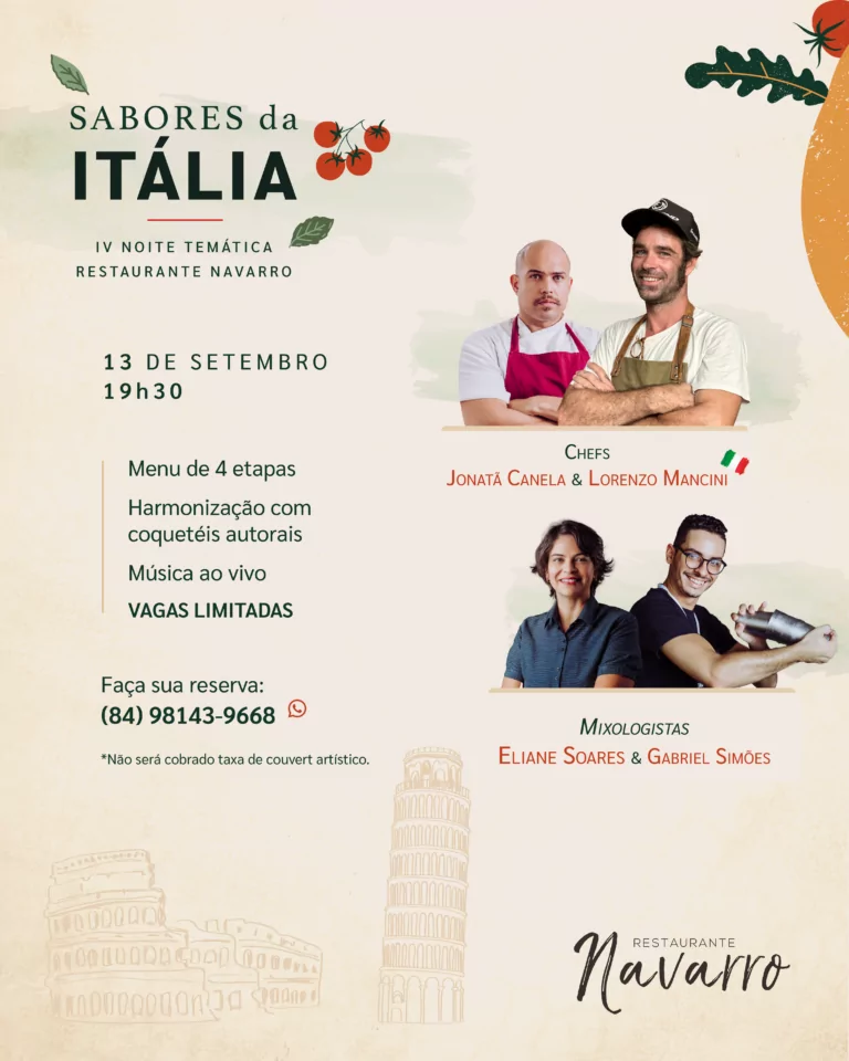 No mês de setembro, o Restaurante Navarro dará sequência ao projeto Noites Temáticas com um jantar “Sabores da Itália” na quarta-feira, 13 de setembro. O evento será comandado pelo chef Jonatã Canela, com a participação especial do chef italiano Lorenzo Mancini, proprietário dos restaurantes Bistrô 70m² e Sampei, em São Miguel do Gostoso. A noite especial terá um menu em quatro etapas, com ingredientes típicos da famosa gastronomia italiana.