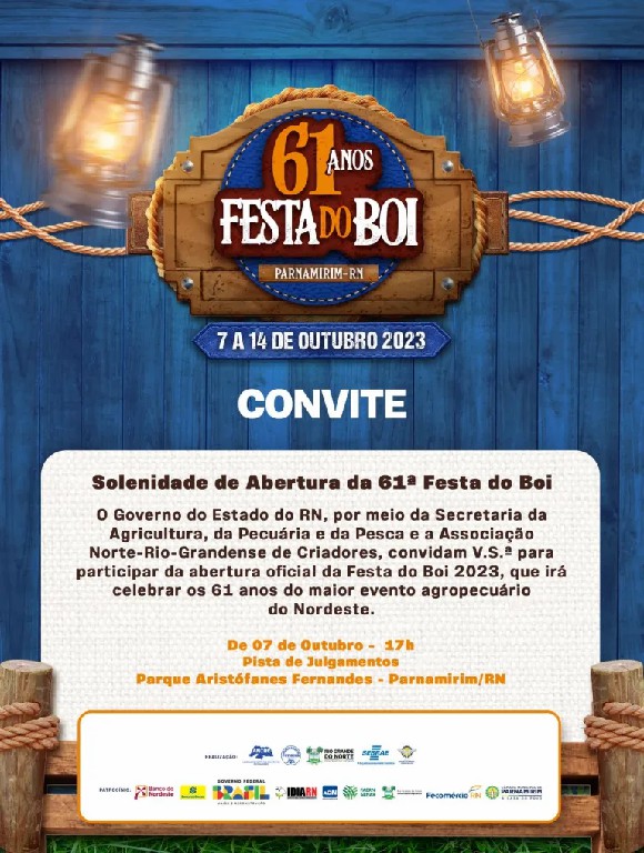 A Festa do Boi, evento mais tradicional do agronegócio potiguar, acontece de 07 a 14 de outubro, no Parque Aristófanes Fernandes, em Parnamirim. A abertura oficial ocorre no sábado (07), a partir das 17h. A programação inclui ainda exposições, leilões e julgamentos de animais, torneios leiteiros, capacitações e oficinas técnicas.