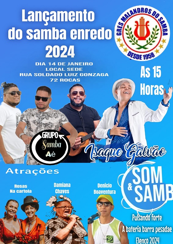 Neste domingo (14), a partir das 15h, o samba pede passagem no bairro das Rocas para o lançamento do samba enredo da Escola Malandros do Samba.