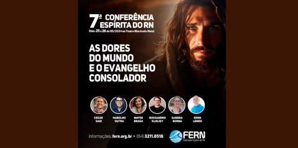 As questões espirituais e as dores na alma que envolvem as doenças como ansiedade e depressão serão abordadas na 7ª Conferência Espírita promovida pela Federação Espírita do Rio Grande do Norte. A programação ocorre nos dias 25 e 26 de maio no Teatro Riachuelo, em Natal. O tema desta edição será: “As Dores do Mundo e o Evangelho Consolador”.