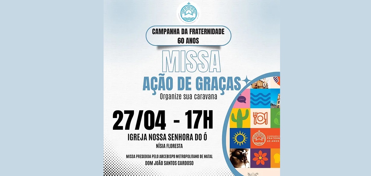 A Arquidiocese de Natal montou uma programação especial para celebrar os 60 anos da Campanha da Fraternidade, que vai ser desenvolvida no decorrer de 2024. A primeira atividade acontecerá no próximo dia 27 de abril, na cidade de Nísia Floresta, berço da Campanha da Fraternidade. Às 17h, em frente à Igreja Matriz de Nossa Senhora do Ó, em Nísia Floresta, será celebrada a missa em ação de graças, presidida pelo Arcebispo Metropolitano, Dom João Santos Cardoso, transmitida pelas redes sociais da Arquidiocese de Natal e pela Rádio Rural – 91.9 FM. Todas as paróquias da Arquidiocese são convidadas a organizarem caravanas e participarem da celebração, que também contará com a participação das pessoas que irão no “Trem da Fraternidade e da Esperança”.