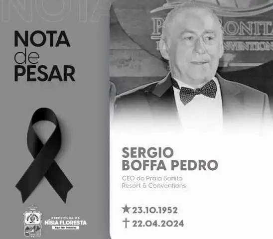 – Com imensa tristeza, o município de Nísia Floresta expressa seu pesar pelo falecimento do Sr. Sergio Boffa Pedro, CEO do Praia Bonita Resort & Conventios, ocorrido nesta segunda-feira (22/04).