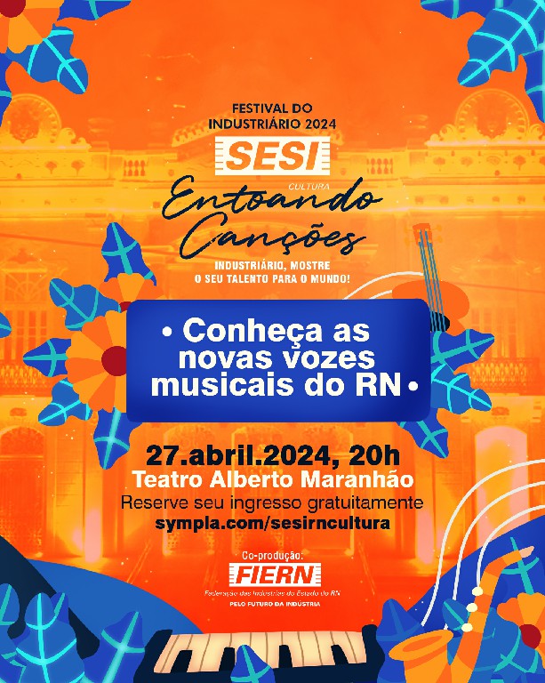Neste sábado, dia 27 de abril, tem apresentação aberta ao público, no Teatro Alberto Maranhão – TAM, às 20h, com as novas vozes musicais do Rio Grande do Norte, durante a Semifinal do Polo Natal do Festival do Industriário 2024 – SESI Entoando Canções. O público pode prestigiar de perto esses novos talentos e para isso basta fazer a reserva prévia dos ingressos (gratuitos) pelo Sympla – www.sympla.com.br/evento/festival-do-industriario-sesi-entoando-cancoes/2423124.