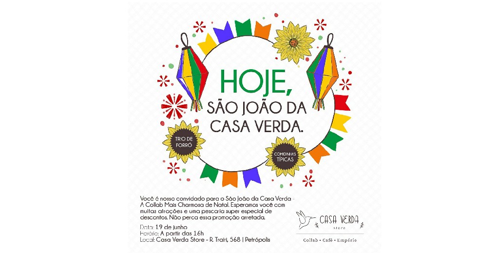 Viva a tradição do SÃO JOÃO e venha festejar na CASA VERDA STORE! A casa preparou uma promoção junina cheia de alegria, diversão, música, comida típica e uma pescaria de descontos incríveis em nossos produtos.