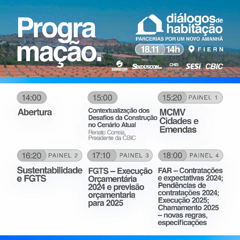 A abertura do Diálogos de Habitação será às 14h, com a presença do secretário Nacional de Habitação, Hailton Madureira; do diretor de Habitação da Caixa, Roberto Ceratto; do presidente da Federação das Indústrias do Estado do Rio Grande do Norte (FIERN), Roberto Serquiz; e dos presidentes do Sinduscon-RN, Sérgio Azevedo, e Sinduscon Oeste-RN, Pedro Escossia; e do vice-presidente de Habitação de Interesse Social da CBIC, Clausens Duarte, além de representantes do governo do estado e do município.