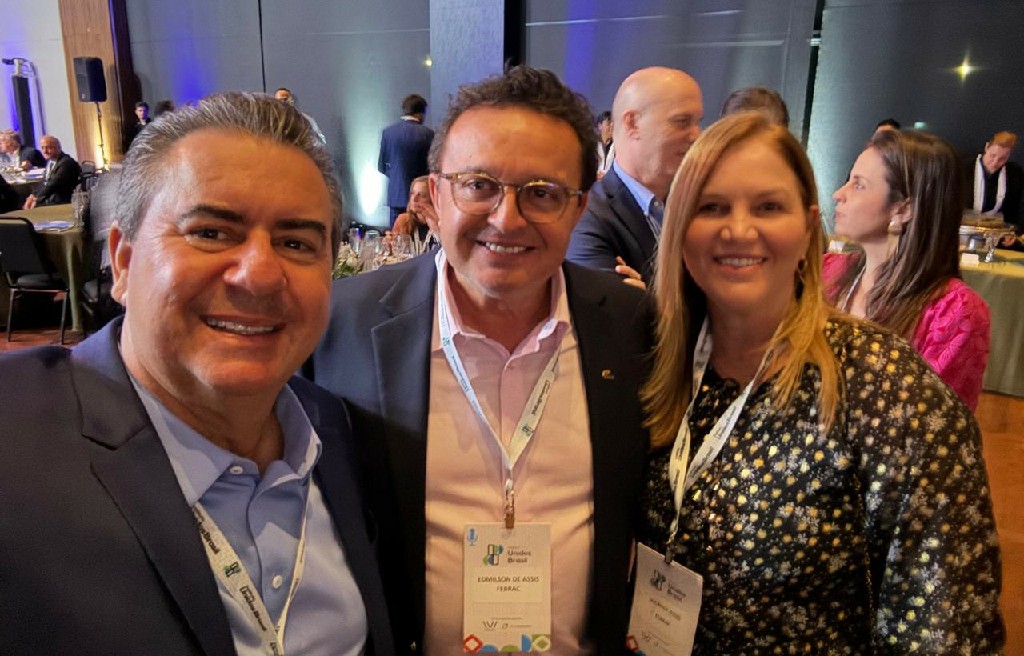 Sob o olhar atento de sua esposa Solange Bezerra, o presidente nacional da FEBRAC e CEO do grupo norte-rio-grandense Interfort Segurança, faz pose ao lado do empresário José Carlos Semenzato, criador da Microlins e dono SMZTO, líder no mercado de franchising no Brasil.