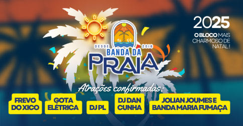 A tradição continua e agora sem a limitação da maré cheia: O primeiro bloco no carnaval de Natal é a Banda da Praia, na Orla de Ponta Negra, no sábado (1º). A partir das 11h3O tem concentração eletrizante na orla, em frente ao Hotel Coral Plaza, com DJ PL e Frevo do Xico; às 14h desfile dos foliões com Frevo do Xico pela orla até o Baile na Praia, entre os quiosques 20 e 21, com previsão de chegada às 15h, para os shows do DJ Dan Cunha, Gota Elétrica, Jolian Joumes e Banda Maria Fumaça.