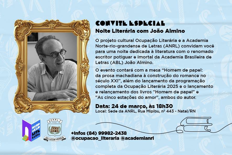 A Academia Norte-Rio-Grandense de Letras (ANRL), em parceria com o projeto Ocupação Literária, realizará uma noite especial dedicada à literatura com a presença do renomado escritor potiguar e imortal da Academia Brasileira de Letras (ABL) João Almino. O evento acontecerá no dia 24 de março (segunda-feira), a partir das 18h30, no prédio da ANRL, localizado na Rua Mipibu, 443, Petrópolis, em Natal.