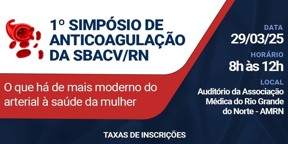 A Sociedade Brasileira de Angiologia e Cirurgia Vascular – Regional Rio Grande do Norte (SBACV/RN) promoverá, no dia 29 de março, das 8h às 12h, o 1º Simpósio de Anticoagulação. O evento vai acontecer no auditório da Associação Médica do Rio Grande do Norte e contará com a participação de renomados especialistas na área.