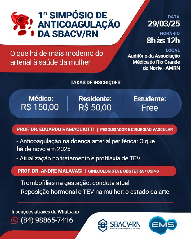 O simpósio é uma realização da SBACV/RN, com o apoio da EMS, e tem como objetivo atualizar e aprofundar o conhecimento sobre anticoagulação, promovendo a troca de experiências entre profissionais da saúde, como médicos angiologistas, cirurgiões vasculares, residentes e estudantes de medicina.