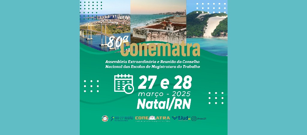 A cidade de Natal vai receber, nos dias 27 e 28 de março, representantes de todas as Escolas de Magistratura e de Escolas Judiciais do Trabalho do país para a 80ª assembleia extraordinária e a reunião do Conselho Nacional das Escolas de Magistratura do Trabalho (Conematra).