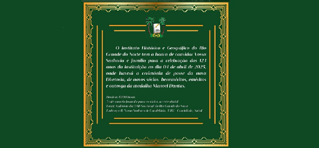O Instituto Histórico e Geográfico do Rio Grande do Norte completou 123 anos no último dia 29 e a celebração acontece na sexta-feira, 4 de abril. A solenidade é promovida no auditório da OAB – Seccional do Rio Grande do Norte, localizado no bairro de Candelária. O evento é aberto para membros da instituição, colaboradores e convidados.