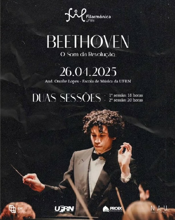 Neste sábado, 26 de abril, a Filarmônica da UFRN convida o público para uma noite de encontros musicais e culturais no concerto “Beethoven: o Som da Revolução”, com sessões às 18h e 20h, na Escola de Música da UFRN. Os ingressos são gratuitos e um novo lote será liberado pelo Sympla, na sexta-feira (25), às 9h.