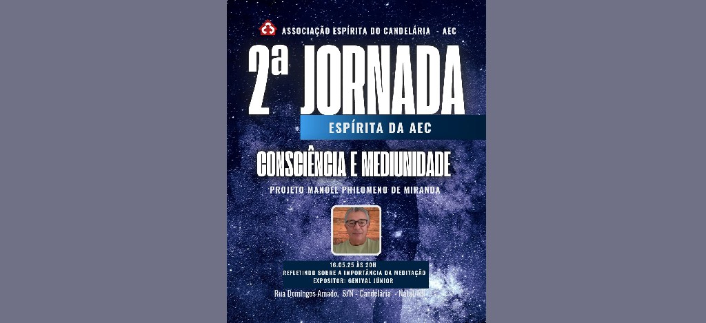 Dando continuidade à programação, a terceira da II Jornada Espírita da AEC terá a presença da prata da casa: Genival Jr., atuante no Movimento Espírita do RN. O evento será realizado nesta sexta-feira (14), {as 20h, na Rua Domingos Amado, s/n – Candelária.