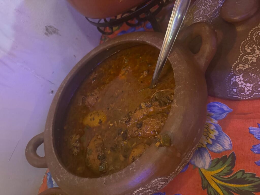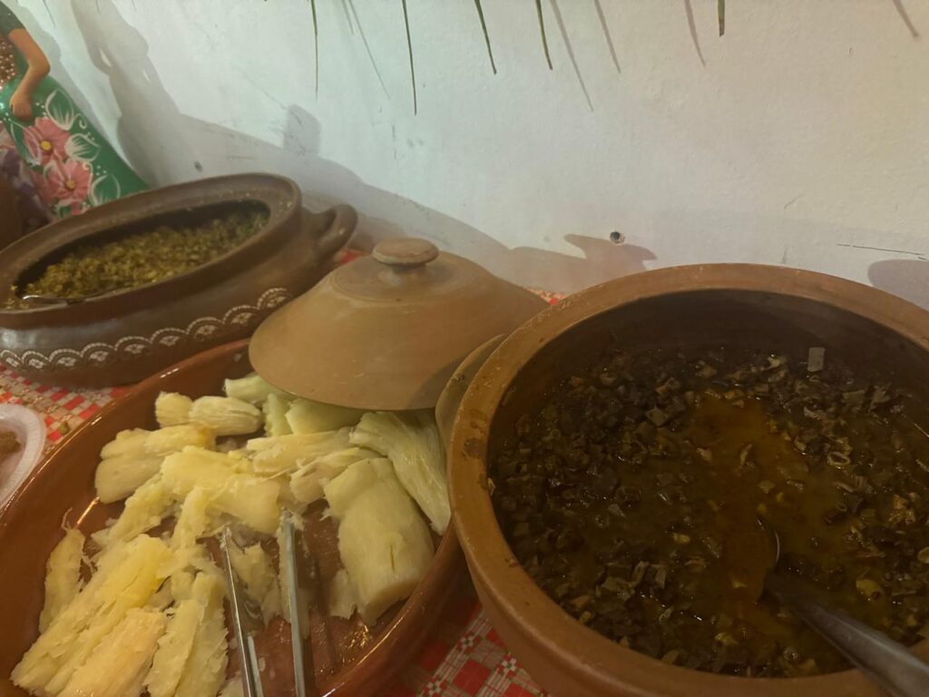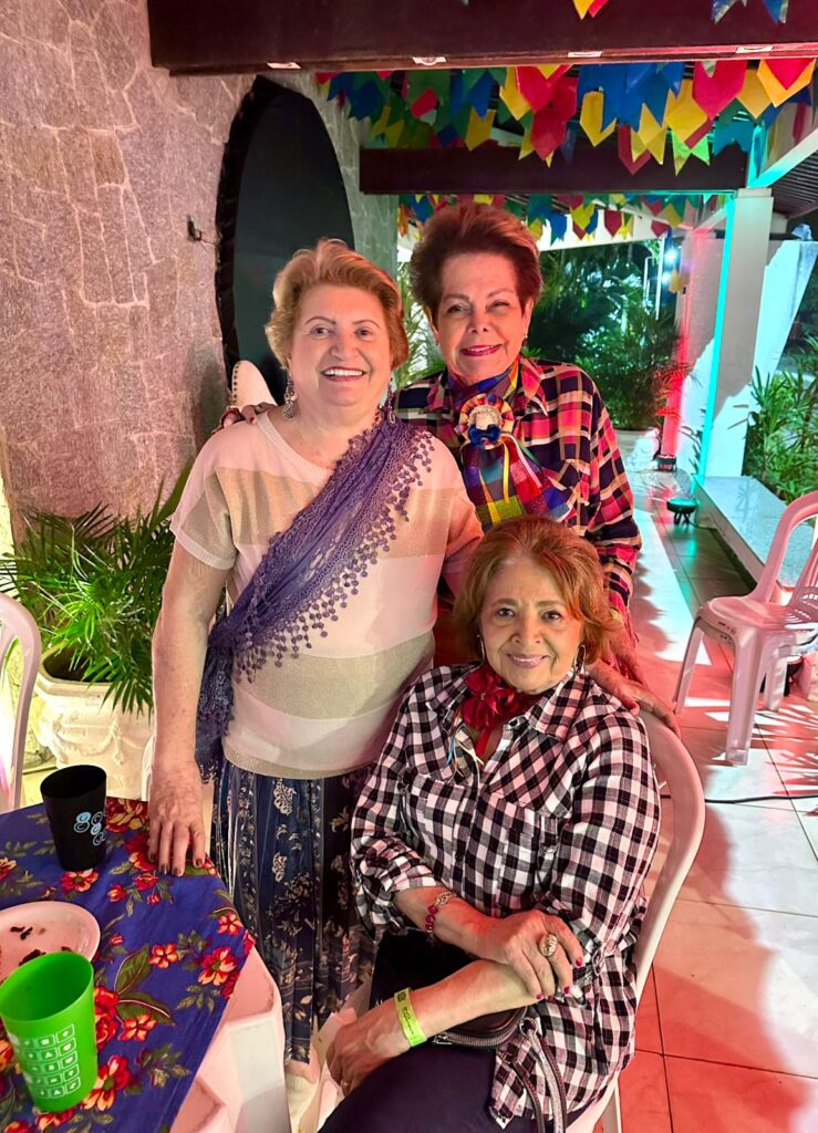 Um autêntico bufê junino pelo chef da casa: paçoca, galinha torrada, carneiro guisado, buchada, macaxeira (que derretia na boca), arroz de carneiro, cachorro quente e, ainda, a mesa com os doces da temporada: canjicas, bolos, tapiocas e o bolo preto, o meu preferido. Na parte externa, um braseiro com espetinhos e carneiro assados na hora.