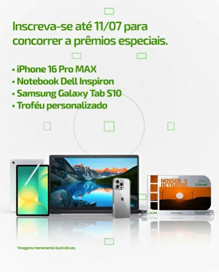 Os autores das melhores fotos vão receber prêmios como iPhone, notebook, tablet e um troféu muito especial. Acesse sicredine.com.br/concursofotografico, confira o regulamento completo e participe.