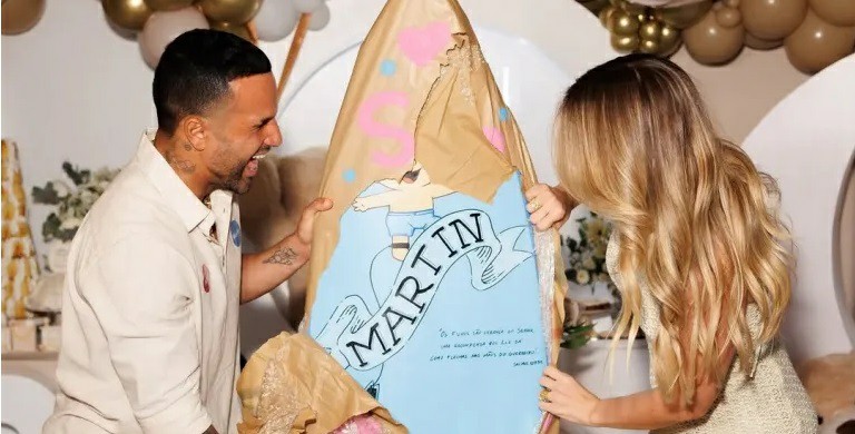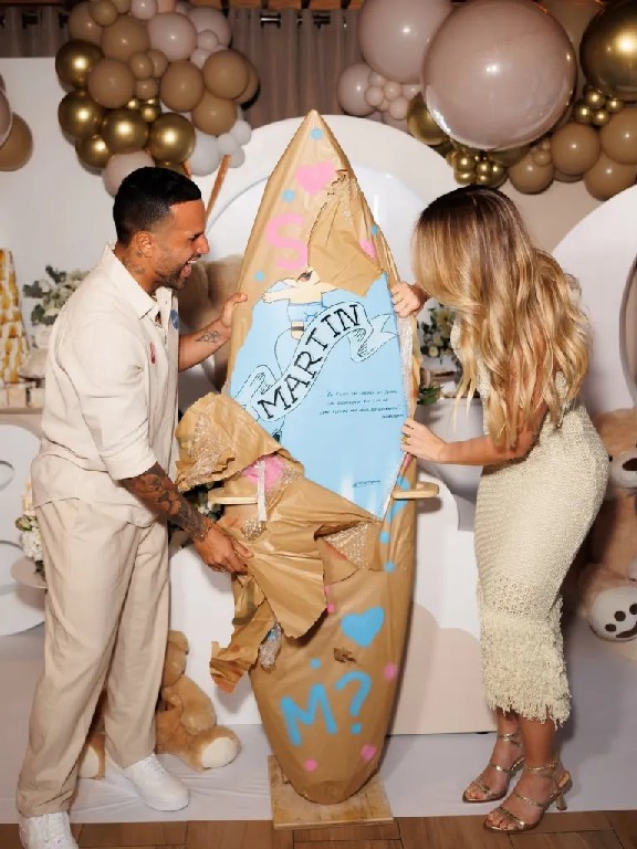 O momento da descoberta aconteceu de forma inusitada: uma prancha de surfe, embrulhada em papel, foi desembrulhada pelo casal e revelou a cor azul, indicando o sexo do bebê. O nome escolhido para o primeiro filho é Martin.