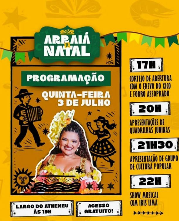 O São João continua com força total em Natal. De 3 a 5 de julho, o Arraiá de Natal toma conta do Largo do Atheneu, no bairro de Petrópolis, com uma programação vibrante que reúne grandes atrações musicais, quadrilhas juninas, manifestações culturais e brincadeiras típicas para todas as idades.