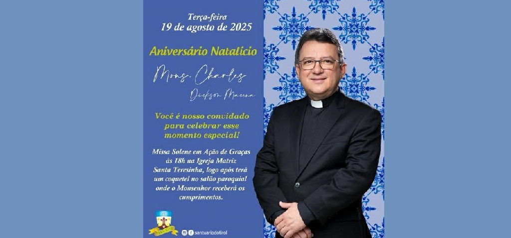 No próximo dia 19 de agosto, às 18h, na Igreja de Santa Teresinha, a comunidade terá a alegria de celebrar, com profundo júbilo e gratidão, o aniversário natalício de nosso estimado Monsenhor Charles Dickson.