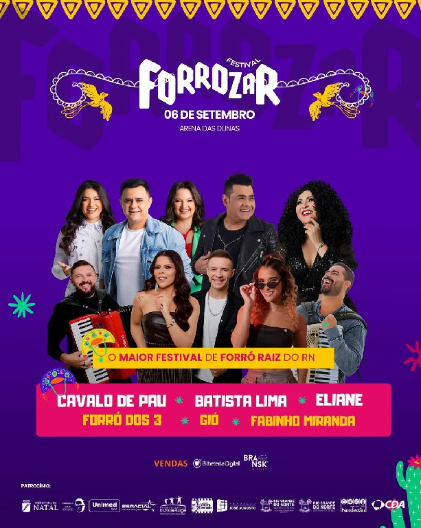 No dia 6 de setembro, a Arena das Dunas será palco de mais de 10 horas de programação que celebram o gênero musical mais emblemático da cultura nordestina. Estão confirmadas atrações como Batista Lima, Eliane – a consagrada “Rainha do Forró”, banda Cavalo de Pau, Forró dos 3, Gió e Fabinho Miranda.