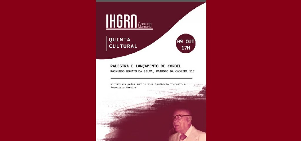 O Instituto Histórico e Geográfico do Rio Grande do Norte realiza a próxima Quinta Cultural no próximo dia 9 às 17h. A programação traz a palestra e lançamento do cordel “Raimundo Nonato da Silva, patrono da cadeira 117”, ministrada por José Gaudêncio Torquato e Francisco Martins, sócios efetivos da instituição.