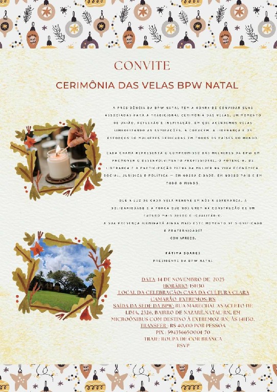 Na tarde desta sexta-feira, seguiremos rumo à CASA CLARA CAMARÃO, em Extremoz, para a nossa confraternização CERIMÔNIA DAS VELAS. Vestiremos branco e brindaremos todas as realizações da equipe BPW sob a presidência da nossa querida Juíza FÁTIMA SOARES.