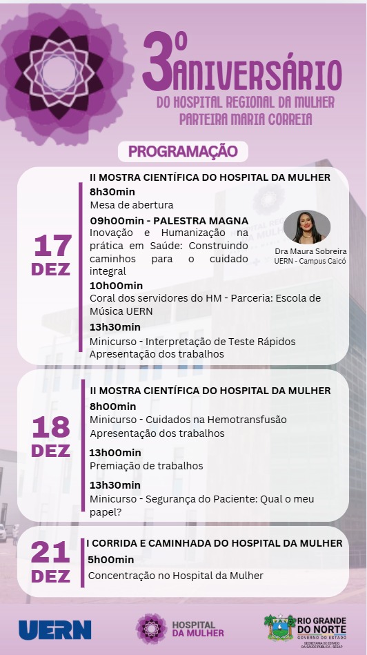 A 1ª Edição da Corrida do Hospital da Mulher será realizada no próximo dia 21, a partir das 5h30, na área externa da unidade hospitalar, em Mossoró/RN. As inscrições estão abertas até o dia 10 e podem ser realizadas pelo link: www.even3.com.br/i-edicao-corrida-do-hospital-da-mulher-mossoro-5km-667475
