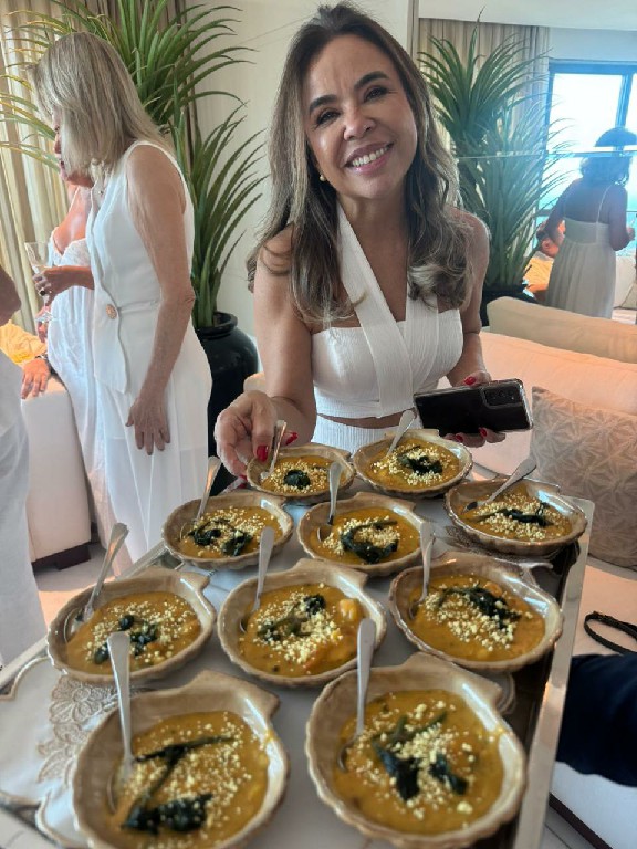 Como disse Dani sobre as delícias servidas, “Ontem nós comemos parte das comidas típicas paraense. Entre elas: maniçoba, peixe filhote no tucupi, camarão rosa, filé da vovó paraense e a farofa do Pará. Taça da felicidade de cupuaçu”. Tudo preparado pela fiel escudeira Fran, com ela mais de três décadas. Tudo divino!