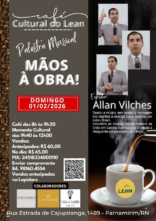 No próximo domingo, 1 de fevereiro, o Café Cultural do Lean tem um encontro marcado para um verdadeiro banquete de luz. desta vez, o tema será “Mãos à obra” e terá como convidado Allan Vilches, orador, músico e voluntário do Hospital Espírita Fabiano de Cristo, em Caieiras (SP).